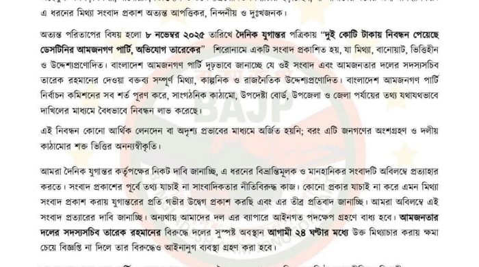 দৈনিক যুগান্তর পত্রিকায় প্রকাশিত মিথ্যা ও বানোয়াট সংবাদ এবং আমজনতার দলের সদস্যসচিব তারেক রহমানের মিথ্যাচারের তীব্র প্রতিবাদ ও নিন্দা জানাচ্ছি। সম্প্রতি আমজনতার দলের সদস্যসচিব তারেক রহমান নিজের দলের নিবন্ধনের দাবিতে